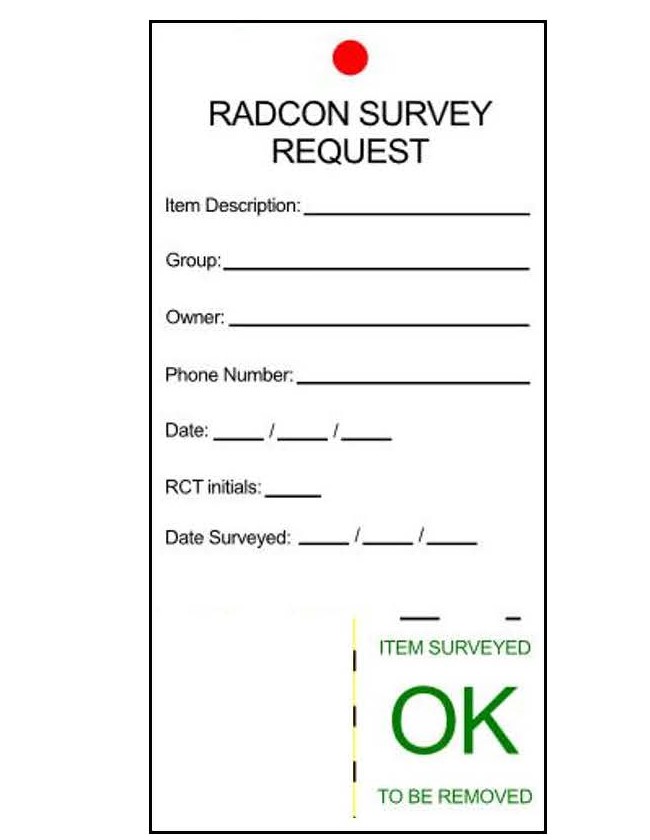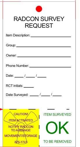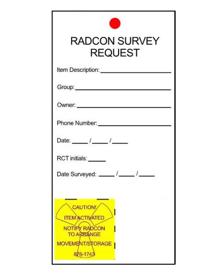 Do you need the material surveyed immediately? Call RadCon at 757-876-1743 Otherwise, the tagged item(s) will be surveyed during RadCon’s twice daily rounds. |
