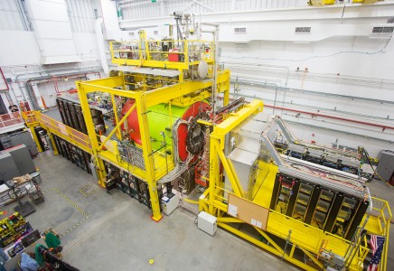 An overhead view of Hall D, the newest experimental hall at Jefferson Lab, and part of the 12 GeV Upgrade project. On Dec. 14, operators of the Continuous Electron Beam Accelerator Facility (CEBAF) delivered 12 GeV electrons (12.065 Giga electron Volts) to the Hall D complex. Critical to the detector system is the superconducting solenoid magnet – the large red and green equipment is the solenoid.