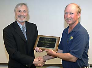 Jefferson Lab recently recognized a grounds maintenance and landscaping business based in Yorktown, Virginia, as its Outstanding Small Business Subcontractor of the Year. Village Greenery, owned and managed by Robert Panchision, received the Southeastern Universities Research Association (SURA)/JLab Outstanding Small Business Subcontractor award for fiscal year 2005. At a reception held March 31, Department of Energy Site Office officials, senior JLab management, Procurement and Facilities Management staff, and a number of Lab employees gathered to congratulate Robert Panchision as he received the award plaque from JLab Director, Christoph Leemann.