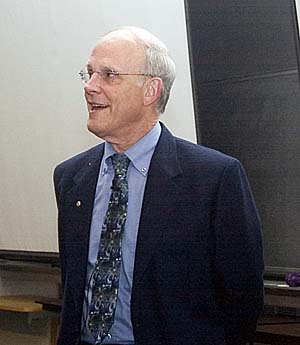 Guest speaker at this year's users meeting and workshop was Physics Nobel Laureate David Gross. On the first day of the meeting, he spoke to scientists during a special session; and that evening he gave a public talk. Both events packed the CEBAF Center auditorium.