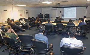 GSA also promotes learning beyond individual students' respective research projects. One program that has proven successful throughout the year is the pizza luncheons hosted by GSA. At the luncheons, students are encouraged to give talks on their research. Such an opportunity provides a friendly, low-pressure environment in which students have the chance to practice speaking in front of an audience. The students who attend the program are also given a chance to learn about their colleagues' and friends' work at the Lab. All too often graduate students are focused only on their individual projects, and as a result, have little knowledge of other experiments going on around them. "It's amazing to me how many of the other experiments I know hardly anything about," laughs Phillips. "It gives us a chance to learn from each other."