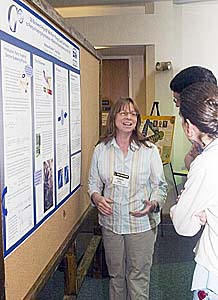 During the recent users group annual workshop and meeting, workshop attendee Colleen Ellis, University of Maryland, discusses recent JLab research with fellow students.