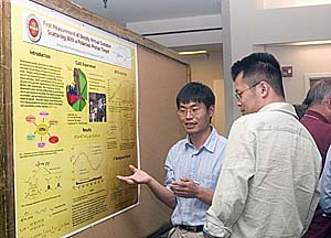Shifeng Chen, Florida State University and third-place poster contest winner, talks with fellow researchers about his work at JLab.