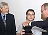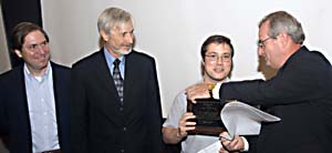 With JLab Users Group Board of Directors Chair Gordon Cates (from left) and Lab Director Christoph Leemann looking on, SURA President Jerry Draayer (far right) presents the 2005 SURA Thesis Prize to Carlos Munoz Camacho, CEA-Saclay. Draayer presented Camacho with a $1,000 check and a plaque.