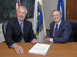 On April 12, the Department of Energy announced that it had selected Jefferson Science Associates, LLC, for the new M&O contract for Jefferson Lab. On April 14, Christoph Leemann, Jefferson Lab Director and President of JSA, LLC, signed the new contract. Director Leemann and JLab’s DOE Site Officer Manager Jim Turi posed for a photo after the contract was signed. JLab is now transitioning to the new contract.