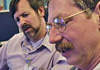 Rox Anderson, right, and Free-Electron Laser Scientist Steve Benson, left, discuss laser beam parameters while conducting the experiment on pig fat.
