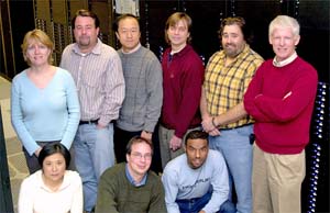 Members of the team that installed, prepared and operate the new 7N cluster computer include (back row, left to right) Sandy Philpott, David Rackley, Jie Chen, Michael Barnes, Randy Hartman and Chip Watson, and (front row, l. to r.) Ying Chen, Balint Joo and Lawrence Sorrillo. Not pictured: Christopher Miller.