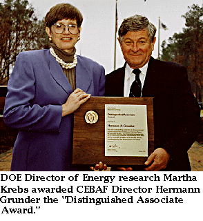 CEBAF Director Hermann Grunder was recently awarded the Department of Energy's "Distinguished Associate Award" for his outstanding leadership in the successful construction of CEBAF. During an "All Hands" staff meeting called by Director of Energy Research Martha Krebs, Grunder received a plaque signed by the Secretary of Energy Hazel O'Leary. The award to Grunder reads "Your inspirational leadership of the laboratory staff has established a firm basis for the scientific program of the facility and its contributions to the advancement of nuclear physics." After a standing ovation, Grunder told the staff that the award wouldn't have been possible without everyone's hard work and dedication.