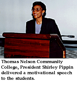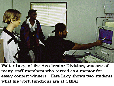 Winners spent the day at CEBAF visiting with scientists, engineers, technologists, and administrators. CEBAF's Warren Buck talked to the students about the contributions made by African American scientists and engineers, while Shirley Pippin, President of Thomas Nelson Community College, delivered a motivational speech based on her experiences while growing up. Buck and Pippin then presented each student with a certificate acknowledging their accomplishment. Lisa Surles of Science Education said, "The biggest reward was the comments from the students and their enthusiasm. They had a really good time."