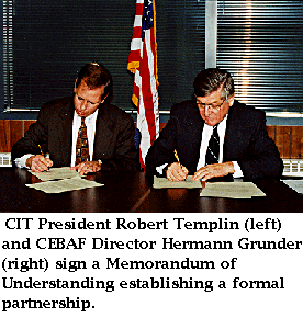 CEBAF and the Center for Innovative Technology (CIT) signed a Memorandum of Understanding on January 17th that will allow the organization to market CEBAF inventions to industry. The partnership will include establishing specific working relationships and programs between CEBAF, industry and CIT to best achieve technology transfer.