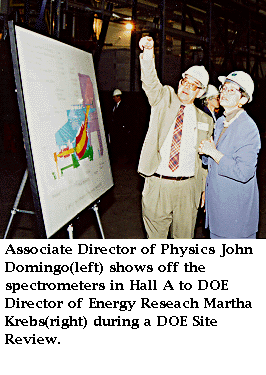 Krebs purpose for coming to CEBAF was to hold a DOE On-Site Review, on February 23, 1996. The same day she held an "all hands" meeting with staff members in the auditorium. Krebs recognized CEBAF's accomplishments, including the Hall C Christening, Dirk Walecka's 1996 Tow W. Bonner Prize in Nuclear Physics, and CEBAF's 1994 DOE M&O Contractor of the Year Award.