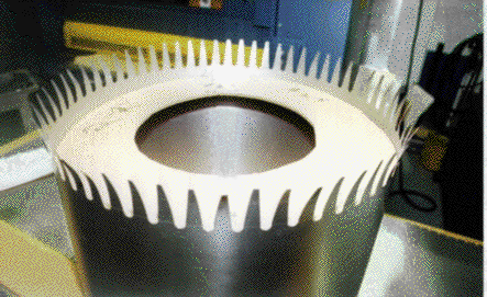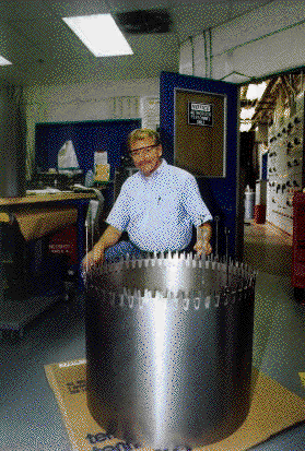 For the furnace's fabrication, Morgan used sheets of niobium 10,000th of an inch thick to construct a series of inserts. Extending from the top of each insert is a series of "teeth" or notches. He painstakingly measured and cut each sheet by hand. Due to the expense of niobium, Morgan says he took precautions to guard against cutting errors. "I measured once, twice, three times, and then took a break. Then I measured one more time before making my cut," says Morgan. After cutting, the ends of each sheet were joined together and spot welded to construct a cylindrical-like shape. The inserts were then sent to Brawley who operates CEBAF's electron welder. Brawley put the inserts into the welder for seam welding of flawless quality. The notches are bent over to secure the sheets together.