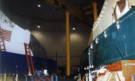 Following the assembly and installation of the support cradles for the two spectrometers in the experimental hall, the superconducting dipole magnets for each are now in place. Weighing approximately 500 tons each, positioning and installing these "bending" magnets was a complex undertaking.