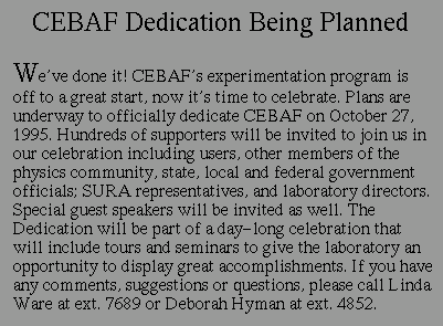 - 4 Gev beam delivered to Hall C target and annoucment of the planning of the CEBAF Dedication.