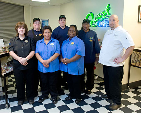 No job is too small for Chef Adrian Durant, no kitchen technique too complicated. Executive Chef of JLab's Quark Cafe since October 2008, Durant can go from minced onions to macédoine with a quick flip of his 12-inch Forschner chef knife. "It doesn't matter what I'm cooking," he says, "as long as it looks good, tastes good." Canadian – make that French Canadian – by birth, Durant grew up in Montreal where fine food was always on the menu. "It was always gourmet at home," he says. His Austrian mother added even more continental flair to the family cuisine. The family moved to Pennsylvania when he was eight, but still goes back to Canada most summers. There was never much doubt about his career path. As a teen-ager, he worked summertime landscaping jobs, but winters inevitably found him indoors, working as a cook. When the JLab position opened up, Durant, with years of head chef experience behind him, was ready for a change. In the restaurant world, hours are long, the pace grueling. "I decided to do something a little more life-related," he explains, "instead of spending every New Year's Eve doing inventory at one-thirty in the morning." Quark Cafe, while still demanding, offers a friendlier, more stable environment. "I really enjoy the family atmosphere here," he says. "Having a real relationship with our customers is great." He has nothing but high praise for his Quark Cafe colleagues. "We have an outstanding team here," he says. "I couldn't wish for a better group to work with." Grill cook Patricia Barry and sous chef Craig Tegenborg work particularly closely with him on meal preparation and to-order cooking. Utility specialist Sandra Graham anchors the catering service and cashier Queen Simon covers the front of the house. But the fine print on everyone's job description includes "whatever needs doing." "Everyone pulls together to get a job done," Durant says. "We can be doing a meal and catering prep, and a delivery comes in that needs to be broken down and put away – everyone knows what needs to be done and does it. I'm proud of the team and proud to be a part of it." Working closely with Quark Cafe manager Gaye Davenport, Durant oversees menus, food orders, recipe selection, inventory management and culinary staff training. Menu planning is an extra challenge at Jefferson Lab, he points out. There's a wide variety of tastes, from vegetarian to down-home to upscale, plus the many countries and cultures represented among the lab's staff, users and visitors. At 20, Durant enrolled at the New England Culinary Institute in Burlington, Vt. NECI attracted him because of its small class size: There were six people in his. Working at The Inn at Essex (a hotel outside Burlington), students learned every aspect of running a restaurant, from baking and planning banquets to wine service and even cleaning out grease traps. At NECI, six months of rigorous classes alternated with an even more grueling six months of hands-on work in real restaurants. Durant's first internship was at Harvest Restaurant, off Harvard Square in Cambridge, Mass. ![]() Quark Cafe staff recently gathered for a group photo; pictured in the front row, left to right, are: Food Services Director Gaye Davenport, Queen Simon, Sandra Graham and Executive Chef Adrian Durant and in the back row, l. to r.: Patricia Barry, Craig Tegenborg and Albert McClinton.