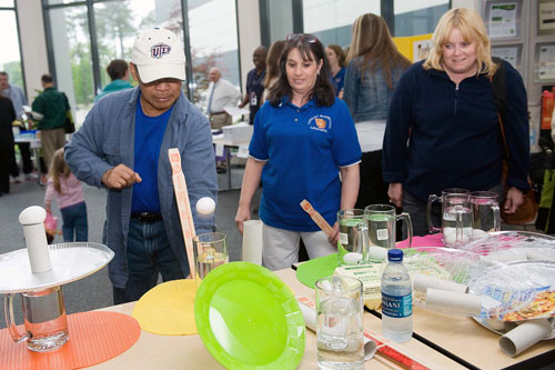 Throughout the school year, from fall to spring, 20 selected 5th, 6th and 8th grade science teachers from across the region gather in Jefferson Lab’s Science Education classroom in the VARC building to engage in a program designed to increase their knowledge of the physical sciences and strengthen their teaching skills. Since 2008, the JLab Science Activities for Teachers (JSAT) program has offered participants hands-on learning, Led by the lab’s Science Education administrator, Lisa Surles-Law, the classes meet in the evenings, every other week, alternating by grade level. This highly successful and sought-after program is funded by a grant from the JSA Initiatives Fund. The program JSAT was created to address a demand in the local teaching community. The coursework is similar to the four-week DOE Academies Creating Teacher Scientists (ACTS) program held at the lab each summer, and includes a basic course in physics, lectures on current research, physical science classroom activities and the completion of a team-based research project under the guidance of Jefferson Lab staff. “Jan Tyler and Sally Fisk really wanted to reach more teachers and arm them with the know-how and confidence Teachers must apply to be admitted to JSAT, providing information on their teaching experience and writing an essay on how the JSAT program will help them reach their teaching goals. This year 43 teachers were accepted into the program. Those who are not formally admitted into the program receive a thumb drive containing all the core materials, which they may use at their schools. Program participants receive instruction in the physical sciences and how to improve their teaching methodology. They also take home the materials they’ve used in each training session and complete kits of hands-on activities to share with their students, such as the ones for the PhysicsQuest competition, sponsored by the American Physical Society. “This program is a valuable resource for teachers of all experience levels,” Surles-Law said. “Teachers network with one another, share ideas and try out the teaching activities before doing them with their students. We’ve found that this program has a far-reaching impact: teachers become empowered and begin to positively influence entire school science programs. ” As in the ACTS program, teachers are limited to attending three years of instruction, and many of them seize the opportunity to take part every year that they can. Their enthusiasm is palpable, and, despite having worked a full day at school, many of them drive from as far away as Southside Hampton Roads, Gloucester, Richmond and Henrico County because they find the program so valuable. JSAT teachers assist the lab with hosting the annual “teacher night.” They invite their fellow teachers to come to the lab to see hands-on demonstrations of classroom projects, pick up teaching materials and learn more about the program. Surles-Law also points out that the learning, networking and access to the lab’s vast and varied resources doesn’t stop at the end of the course. “They can call us with questions, borrow things, and ask for help,” she said. “Once you’re part of the Jefferson Lab community, you’re always able to stay connected By Judi Tull Program Excites Teachers: What They Get, Take Back to Classroom, Share With Fellow Teachers![]() Ray Yoh has had a long association with teacher enrichment programs at Jefferson Lab. He is a “graduate” of JLab’s Academies Creating Teacher Scientists program and the earlier Physics Enrichment for Science Teachers program. Yoh became a volunteer teacher in the JSAT program three years ago. Here he talks with teachers in the JSAT program.