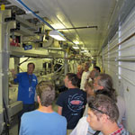 ![]() This photo is of the Q-weak experiment's target cell block that was used during the Q-weak Run I period. The target loop, which is almost two meters long and has a volume of 54 liters, runs vertically, on top of the target cell block. This system was designed using computational fluid dynamics (CFD).Staff Scientist Silviu Covrig was involved in designing, building and commissioning the 2500 W liquid hydrogen target for the Q-weak experiment that recently finished running in Hall C. Photo: Silviu Covrig, JLab