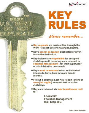 A study of bound protons and neutrons conducted at Jefferson Lab has allowed scientists, for the first time, to extract information through experimentation about the internal structure of free neutrons, without the assistance of a theoretical model. The result was published in the Feb. 4 issue of Physical Review Letters. The major hurdle for scientists who study the internal structure of the neutron is that most neutrons are bound up inside the nucleus of atoms to protons. In nature, a free neutron lasts for only a few minutes, while in the nucleus, neutrons are always encumbered by the proton. To tease out a description of a free neutron, a group of scientists compared data collected at Jefferson Lab and the SLAC National Accelerator Laboratory that detail how bound protons and neutrons in the nucleus of the atom display two very different effects. Both protons and neutrons are referred to as nucleons. "Both effects are due to the nucleons behaving like they are not free," says Doug Higinbotham, a Jefferson Lab staff scientist. Nucleons appear to differ when they are tightly bound in heavier nuclei versus when they are loosely bound in light nuclei. In the first effect, experiments have shown that nucleons tightly bound in a heavy nucleus pair up more often than those loosely bound in a light nucleus. "The first thing was the probability of finding two nucleons close together in the nucleus, what we call a short-range correlation," says Larry Weinstein, a professor at Old Dominion University. "And the probability that the two nucleons are in a short-range correlation increases as the nucleus gets heavier." Meanwhile, other experiments have shown a clear difference in how the proton's building blocks, called quarks, are distributed in heavy nuclei versus light nuclei. This difference is called the EMC Effect. "People were measuring and discussing the EMC effect. And people were discussing things about the short-range correlations effect. Nobody bothered to look to see if there's any connection between them," adds Eliezer Piasetzky, a professor at Tel Aviv University in Israel. When the group combined the data from a half-dozen experiments regarding these two different effects on one graph, they found that the two effects were correlated. "Take a quantity that tells you how strong the EMC Effect is. And then take another quantity that tells you how many short-range correlations you have," Higinbotham explains. "And you see that when one is big, the other one is big. When one is small, the other one is small." The scientists say that it's unlikely that one effect causes the other. Rather, the data shows that there is a common cause for both. "I think that we certainly agree that from the position picture, it's due to nucleons overlapping that is causing this. And in the momentum picture, it is the high-momentum nucleons that are causing this. And, of course, it's quantum mechanics, so choose your picture," Higinbotham explains. The group says the common cause may have remained a mystery for so long, because while the two effects they are studying are obviously related when laid out on a graph, the connection was previously obscured by the different, yet related ways in which the two effects are studied. "When you do a measurement for the EMC Effect, what you do is you look inside the nucleon. You break open the nucleon and see inside. What happens inside the nucleon is very different from the short-range correlations, which is what happens between two different nucleons," Piasetzky says. "What's very new here is that we have linked two fields that were completely disconnected. So now you can start asking questions about what that connection can help us learn," Higinbotham says. They say the next step is to further compare the data from all of the source experiments that they used in their analysis to see if data for one effect may now be used to learn something new about the other. Then, of course, they'd like to use the knowledge that the two effects are connected to design new experiments for shining a light on other secrets buried in the nucleus of the atom. This work was supported in part by the Department of Energy's Office of Science, the National Science Foundation, the Israel Science Foundation, and the U.S.-Israeli Bi-National Science Foundation. By Kandice Carter Property & Key Validations and Property Training UnderwayEveryone With A JLab Key Must Complete Key Validation By April 30Every person who has one or more JLab keys must validate each key issued to them. To begin the validation process, use the link below and complete the audit as directed. If you currently have any non-essential or non-functional JLab keys, please return them to Dennis Merritt, the Facilities Management and Logistics locksmith, Mail Stop 28G. If you have questions about the validation, email Merritt at: merritt@jlab.org . At JLab: Copy and paste the following link into your Internet provider (i.e., Mozilla Firefox or Internet Explorer) URL line. Hit the Enter key and you should be directed to the Key Validation sign in screen: Then follow the instructions on the right side of the screen; be sure to click on the Submit Audit button before Logging Out of the system. To accomplish this Key Validation if you are currently away from JLab, please do the following: Subcontractors without JLab email accounts will be contacted by Merritt. JLab key handling guidance is available on this flier: http://www.jlab.org/fm/property/keyPoster.pdf. Account For Assigned Property & Take Property Refresher TrainingNearly every employee at Jefferson Lab is a property custodian. A property custodian is responsible for the proper use, control, physical protection and disposition of assigned property – be it one item or 100. Part of this responsibility includes validating all items on their inventory lists, and taking the Property Custodian Refresher training, on an annual basis. This year's property validation period began Ma