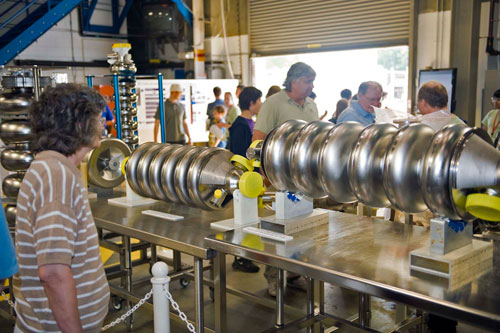 The team has built three cavities in the final prototype shape. The two best cavities will each be assembled into an accelerator unit, called a cryomodule. Like all accelerator cavities built with superconducting radiofrequency technology, these cavities need to be kept at just a few degrees above zero to function properly. APS will purchase a new refrigeration system to cool the cavities, and the cryomodules will insulate the cavities during operation to help keep them cold. The test cryomodule will be ready for installation and first testing in the APS in October 2013. "There are two requirements: one is the requirement for the cavities to operate and chirp the beam. The other is for the cavities to not disturb the beam when they're not being operated, so that the APS operators can turn on an experiment and turn it off, and it has no effect on beam going through," Mammosser says. Following successful testing of the test cryomodule and pending approvals, the team will then move forward with building two complete cryomodules to be installed in the APS. "They need four cavities in each one, and there will be two cryomodules – one to chirp the beam and one to un-chirp the beam," he says. Mammosser says the team owes the successful manufacture of the challenging design to the dedicated Jefferson Lab staff. "I think the Machine Shop just did a fantastic job. They paid attention to all the details, and they really did a great job in fabricating all the parts. And when you see this, it's really a piece of artwork. So we really need to give them kudos," he adds. It's hoped that projects like this one will usher in a new tool in a budding scientific discipline, called control science. The idea of control science is that observing and gaining understanding of the interactions among atoms and molecules that determine material properties and processes will one day allow us to begin directing those interactions and controlling the outcomes on a molecule-by-molecule and atom-by-atom basis. It could be that control science will one day make use of the decades of research that have led to our understanding of the properties of the atom's constituents, such as the research here at Jefferson Lab, leading to new materials and processes that will directly benefit society. By Kandice Carter |