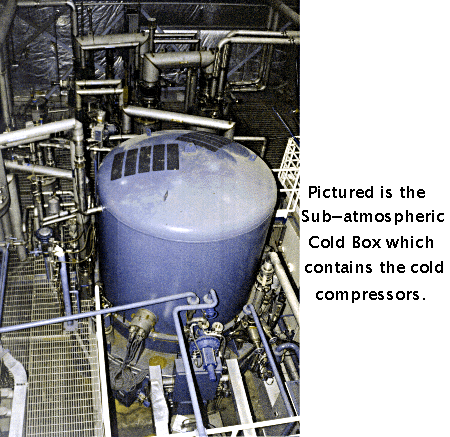 Each of CEBAF's helium refrigerators perform a series of processes to achieve that end. First, warm compressors compress room temperature helium gas to twenty times the normal atmospheric pressure. From there, the helium enters the first of a series of heat exchangers where the helium is cooled to 80 Kelvin or negative 316 °F. Next, turbine expanders, remove a portion of the remaining heat from the gaseous helium until it is cold enough to be converted to a liquid. Gaseous helium flows into cryomodules or magnets where a Joule Thompson valve liquefies a portion of the gas.