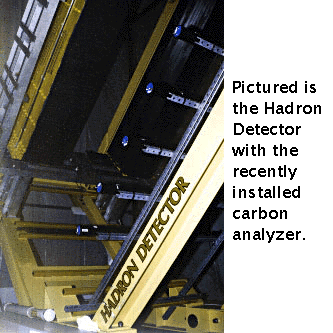 Once the protons have been focused by the spectrometer and their path determined by the two front straw chambers, they then enter the 6,000-pound carbon analyzer. The analyzer consists of large slabs of graphite."The graphite slabs re-scatter the protons. The manner in which theprotonsscatteris determined by thespinoneach proton," says Rutt. After the protons pass through the carbon analyzer, they enter the rear straw chambers which re- analyze their trajectory. "By knowing the proton's trajectory before and after the carbon analyzer, we are able to ascertain its spin. This knowledge is necessary for many of the experiments that will utilize the polarized beam available at CEBAF," claims Rutt.