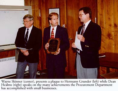 During the presentation made by the Department of Energy Site Office, Jefferson Lab was recognized for the many procurement awards it has won in the past and for its increased efforts to use small businesses. "Since 1990, Jefferson Lab has won four Secretary of Energy awards," said Dean Helms, DOE Site Office Manager. "Small business use has increased 34 percent, small disadvantaged-owned business use has increased 380 percent and women-owned business use has increased 164 percent." According to Wayne Skinner, DOE Site Office Contracting Officer, these increases mean, "Jefferson Lab is a leader not only within the Oak Ridge family but it is a leader within the DOE."