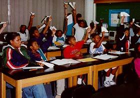 The 1996-97 Jefferson Lab BEAMS program is off to a flying start. The year started the week of September 30 with 6th graders from Huntington Middle School in Newport News. The students took a tour of the lab, participated in a slow bicycle race, performed experiments with liquid nitrogen, and tested the flight of paper airplanes (left). This year the education program will host 54 classes from 10 schools in Newport News, Hampton, York County, and Williamsburg/James City County.