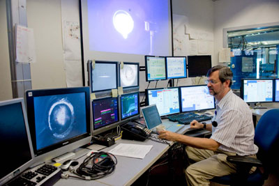 ![]() Free-Electron Laser Division members oversee operations from the FEL control room during a UV run earlier this month. Clockwise from the 12 o'clock position: Steve Benson, FEL physics, manages laser operations while Pavel Evtushenko, instrumentation and controls, drives the electron beam. Tom Powers, radiofrequency systems, in the shift operations position; Joe Gubeli, laser systems, and Jim Kortze, I&C, carry out shift operations.