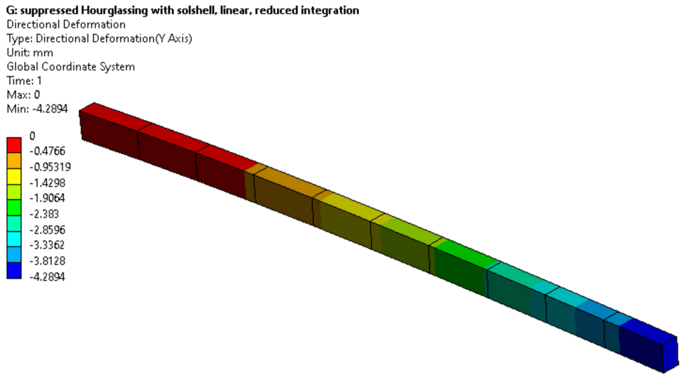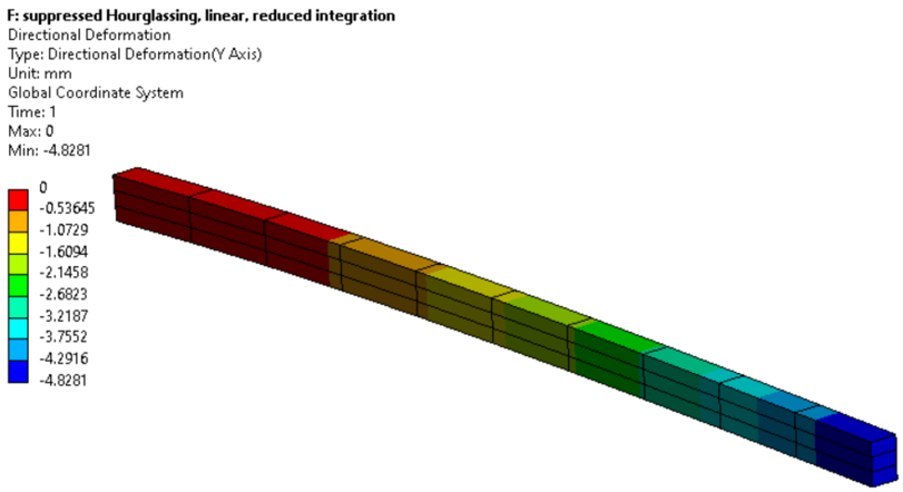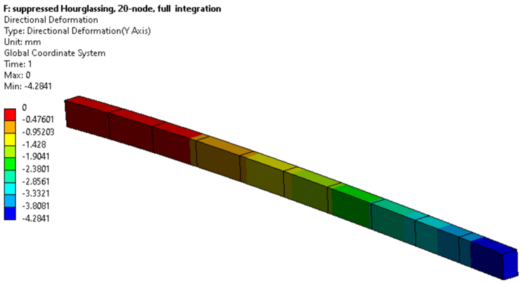 If only one layer of reduced 20-node elements is used, the problem is not fully defined, which leads to no solution, However, one layer of fully integrated 20-node elements produces 4.284 mm, which is very close to 4.281 mm.
