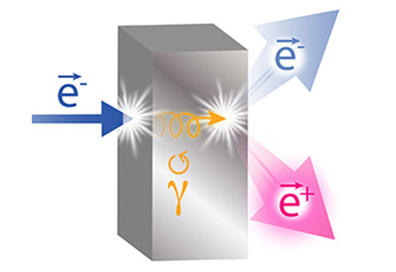 Electron-positron pairs (e-e+) result when an energetic electron beam strikes matter. If the electron beam is polarized, with most of the electrons spinning in the same direction, that polarization can be passed on to the new electrons and positrons.