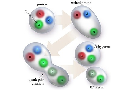 Researchers added extra energy to the proton to produce a pair of quarks, which then yielded new particles. In this illustration, a strange/anti-strange quark pair (s and s) yields a Lambda (^) hyperon and Kaon (K+ meson). The researchers found that strange/anti-strange quark pairs were produced about one-third as often as pairs of up/anti-up (u) and down/anti-down (d) quarks.