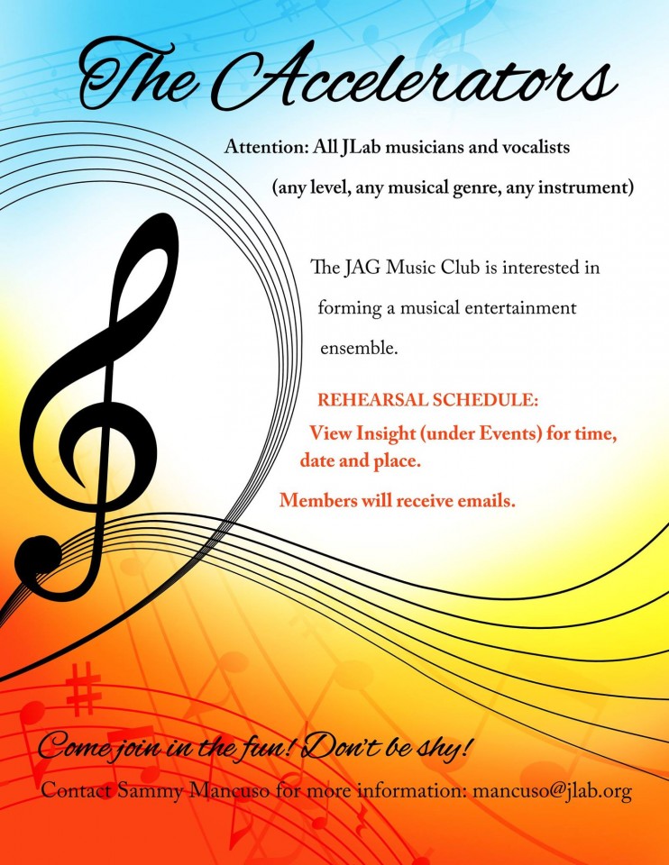 Attention: All JLab musicians and vocalists (any level, any musical genre, any instrument). The JAG Music Club is interested in forming a musical entertainment ensemble.